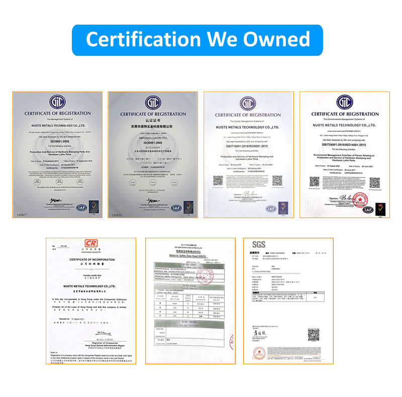 নুওট মেটাল ফ্ল্যাট হেড হাফ টিউবুলার রিভেটের প্রতিটি চালানের সাথে বিশ্লেষণের একটি সার্টিফিকেট (CoA) প্রদান করে, যার মধ্যে রয়েছে: