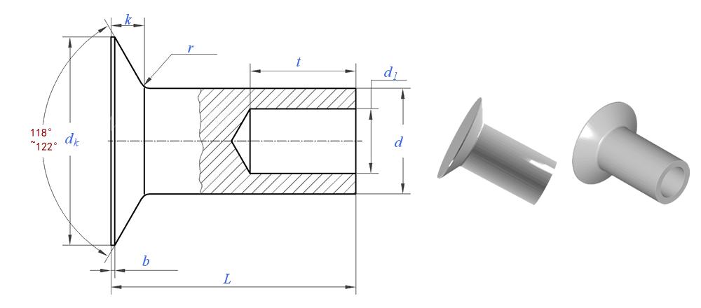 A কাউন্টারসঙ্ক হেড আধা-টিউবুলার রিভেট তারা পৃষ্ঠতল এবং তাদের হাফওয়ে ড্রিলড-আউট ডিজাইনের সাথে ফ্লাশ করে বসার সাথে বৈশিষ্ট্যযুক্ত।
