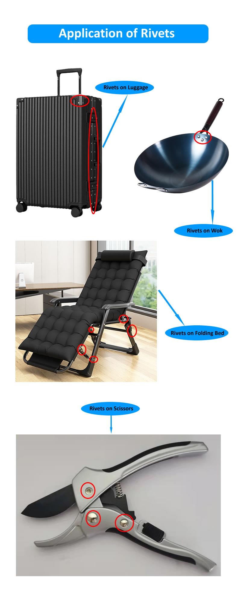 রিভেটগুলি বিভিন্ন ক্ষেত্রে প্রয়োগ করা যেতে পারে, এখানে আমরা আমাদের বিদ্যমান গ্রাহকদের পণ্যগুলির কিছু ইনস্টলেশন কেস তালিকাভুক্ত করি।